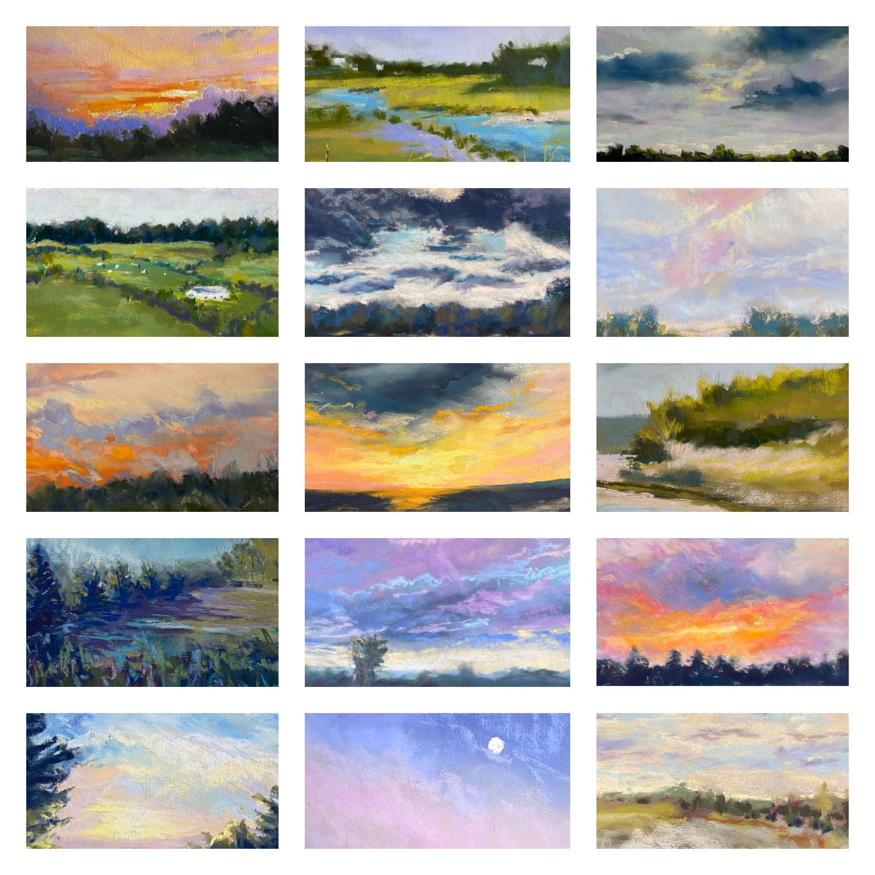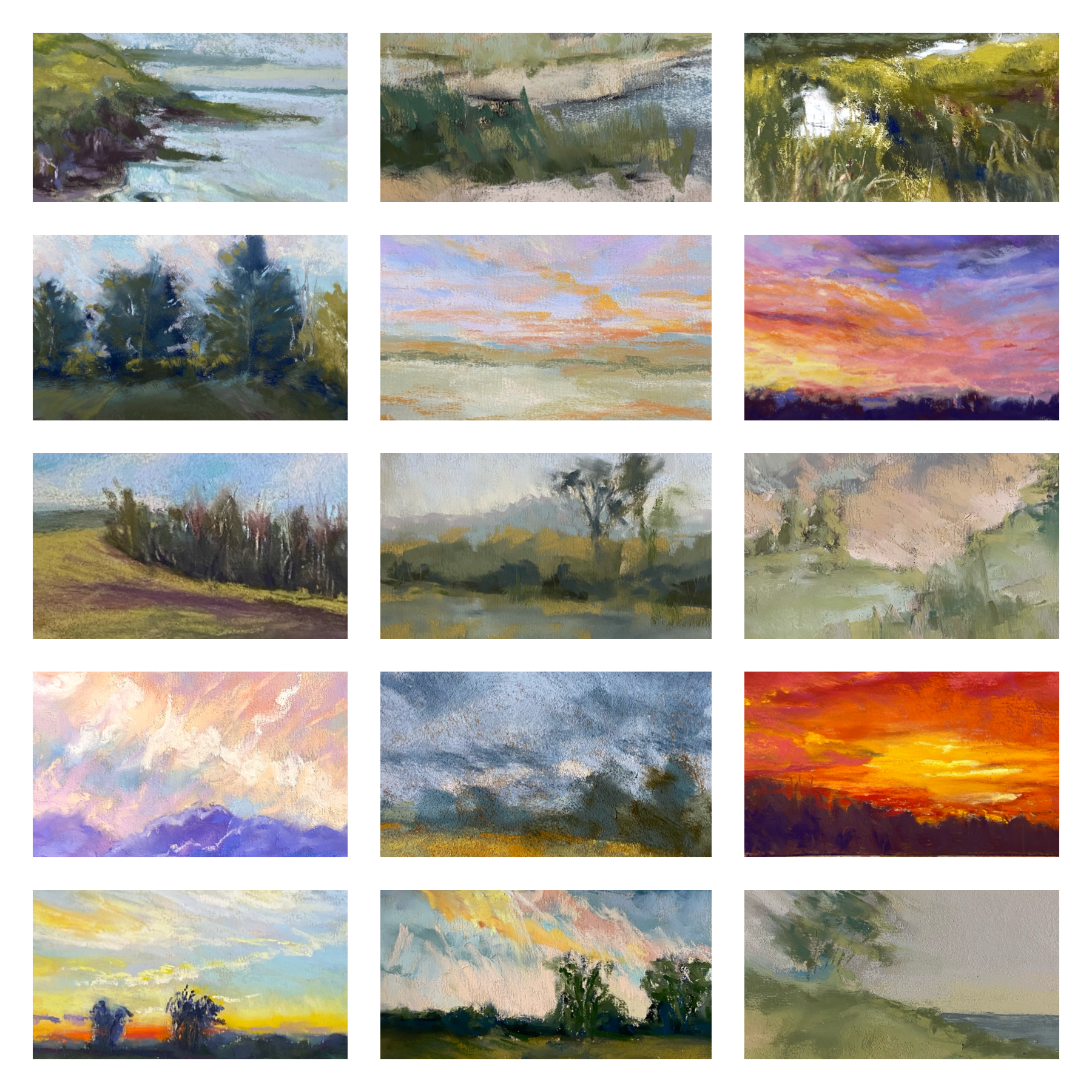 30 new paintings, from the 100-day project, exploring the beautiful and memorable horizons I’ve experienced. These are cropped smaller than the original 6”x6” square painting, showing just a snippet of each.